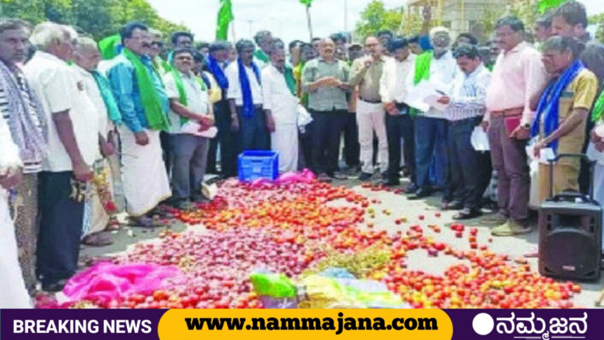 ರೈತಸಂಘದ ರಾಜ್ಯ ಉಪಾಧ್ಯಕ್ಷ ಬೇಡರೆಡ್ಡಿಹಳ್ಳಿ ಬಸವರೆಡ್ಡಿ ಮಾತನಾಡಿ, ಸಾವಿರಾರು ಎಕರೆ ಪ್ರದೇಶದಲ್ಲಿ ರೈತರು ಬೆಳೆದ ಈರುಳ್ಳಿ ಹಾಗೂ ಟೊಮೆಟೊ ಬೆಳೆಗಳಿಗೆ ಸೂಕ್ತ ಬೆಲೆ ಸಿಗಲಿಲ್ಲ. ಪ್ರತಿ ಎಕರೆಗೆ ಸುಮಾರು 30 ಸಾವಿರಕ್ಕೂ ಹೆಚ್ಚು ಹಣ ಖರ್ಚು ಮಾಡಿ ಹತ್ತಾರು ಎಕರೆ ಪ್ರದೇಶದಲ್ಲಿ ಬೆಳೆದ ರೈತರು ನಾಲ್ಕು ಲಕ್ಷ ನಷ್ಟ ಸಂಭವಿಸಿ ಚಿಂತೆಗೀಡಾಗಿದ್ದಾನೆ.