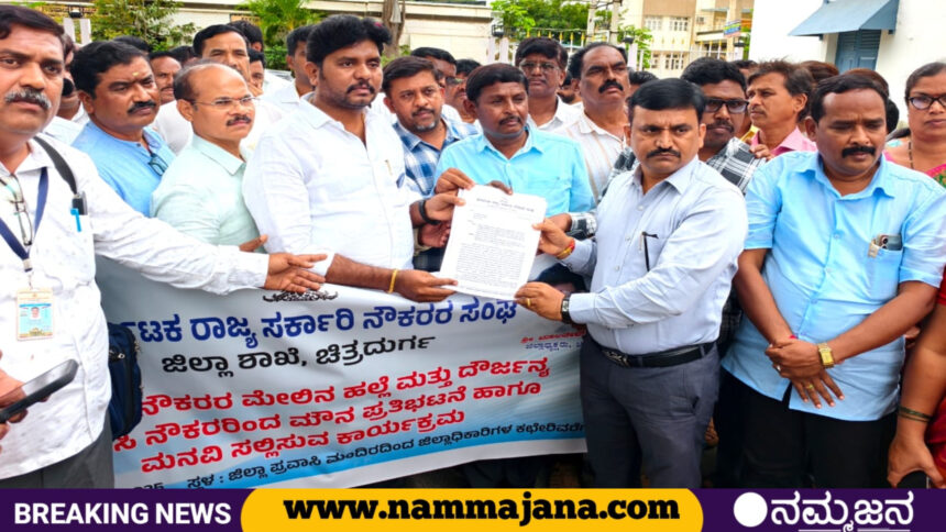 ನಮ್ಮಜನ ನ್ಯೂಸ್ ಕಾಂ, ಚಿತ್ರದುರ್ಗ: ಸರ್ಕಾರಿ (Government employees protest) ನೌಕರರ ಮೇಲಿನ ಹಲ್ಲೆ ಮತ್ತು ದೌರ್ಜನ್ಯ ಖಂಡಿಸಿ ಕರ್ನಾಟಕ ರಾಜ್ಯ ಸರ್ಕಾರಿ ನೌಕರರ ಸಂಘ ಜಿಲ್ಲಾ ಶಾಖೆ ವತಿಯಿಂದ ಶುಕ್ರವಾರ ಮೌನ ಪ್ರತಿಭಟನೆ ನಡೆಸಲಾಯಿತು.