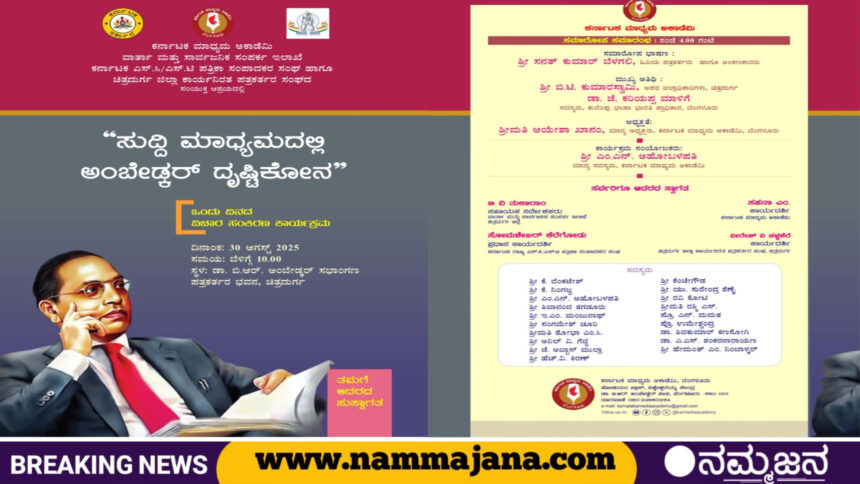 ನಮ್ಮಜನ ನ್ಯೂಸ್ ಕಾಂ,ಚಿತ್ರದುರ್ಗ: ಕರ್ನಾಟಕ(Seminar) ಮಾಧ್ಯಮ ಅಕಾಡೆಮಿ, ವಾರ್ತಾ ಮತ್ತು ಸಾರ್ವಜನಿಕ ಸಂಪರ್ಕ ಇಲಾಖೆ, ಕರ್ನಾಟಕ ಎಸ್ಸಿ/ಎಸ್ಟಿ ಪತ್ರಿಕಾ ಸಂಪಾದಕರ ಸಂಘ ಹಾಗೂ ಚಿತ್ರದುರ್ಗ ಜಿಲ್ಲಾ ಕಾರ್ಯನಿರತ ಪತ್ರಕರ್ತರ ಸಂಘ ಇವರ ಸಂಯುಕ್ತ ಆಶ್ರಯದಲ್ಲಿ “ಸುದ್ದಿ ಮಾಧ್ಯಮದಲ್ಲಿ ಅಂಬೇಡ್ಕರ್ ದೃಷ್ಟಿಕೋನ” ವಿಷಯ ಕುರಿತು ಒಂದು ದಿನದ ವಿಚಾರಸಂಕಿರಣ ಕಾರ್ಯಕ್ರಮ ಆ. 30 ರಂದು ಬೆಳಿಗ್ಗೆ 10 ಗಂಟೆಗೆ ಪತ್ರಿಕಾ ಭವನದ “ಡಾ. ಬಿ.ಆರ್. ಅಂಬೇಡ್ಕರ್ ಸಭಾಂಗಣ”ದಲ್ಲಿ ಆಯೋಜಿಸಲಾಗಿದೆ.